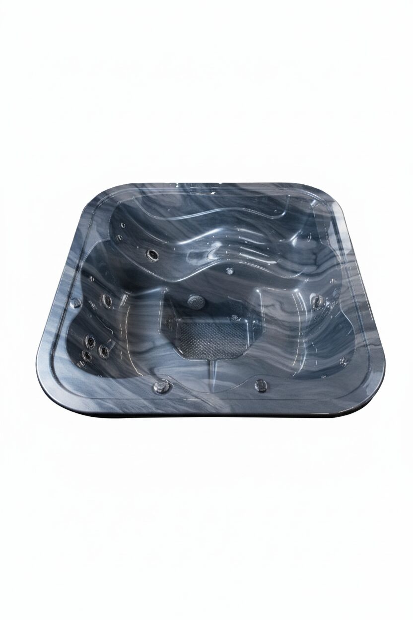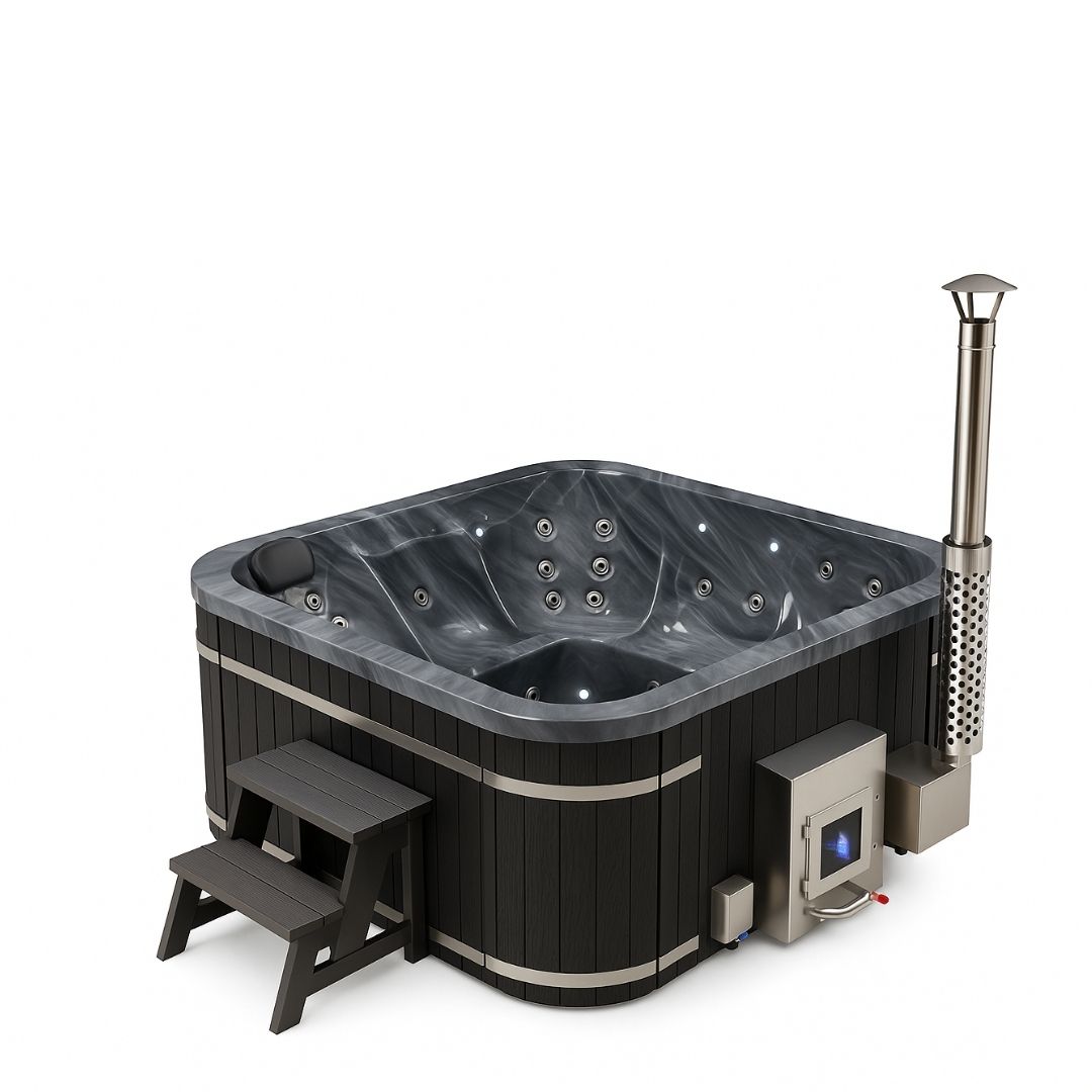 Ciubăr pătrat BRUGIA din acryl Odyssey Marble – 6 persoane, cu șezlong, sistem de masaj complet, LED RGB, încălzire pe lemne + electrică și igienizare UV.
