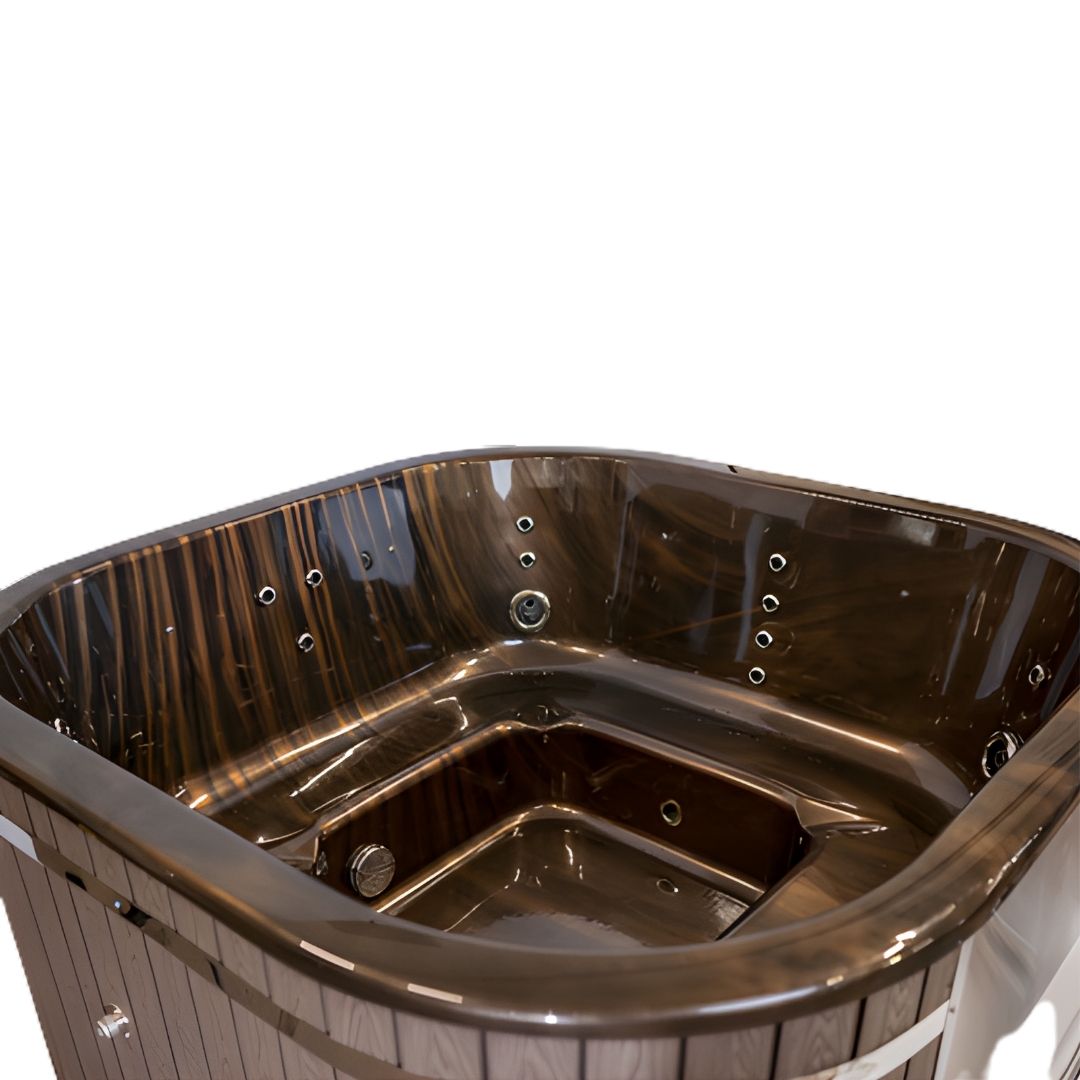 Ciubăr pătrat din acryl pentru 8 persoane, cu încălzire pe lemne și electrică, sistem UV și hidromasaj combinat. Design modern, igienă perfectă, confort premium.