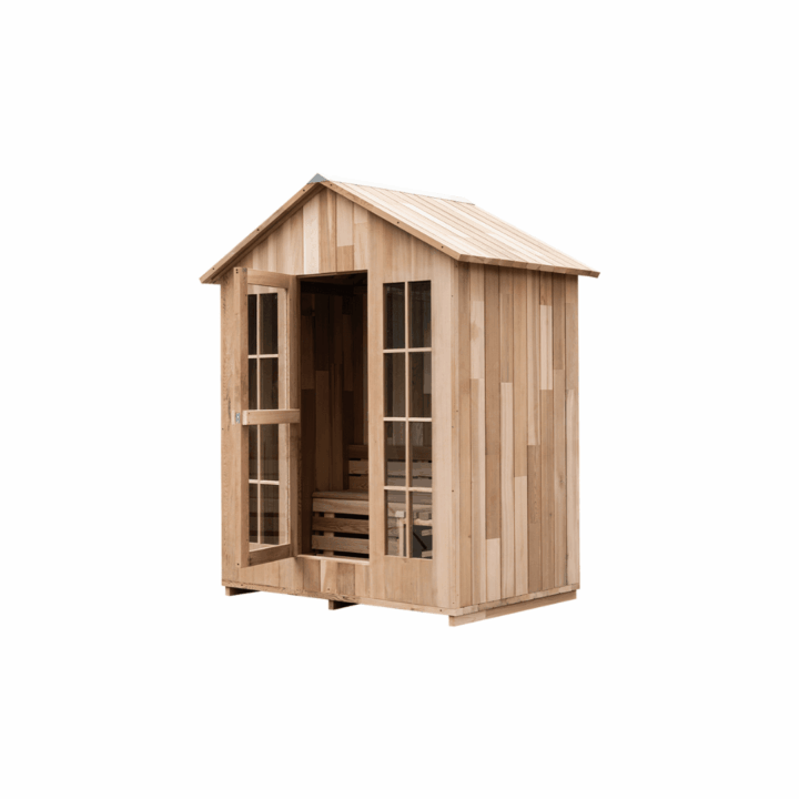 O saună mică, dar cu impact mare – creată special pentru cupluri sau pentru cei care își doresc un spațiu intim de relaxare în aer liber.