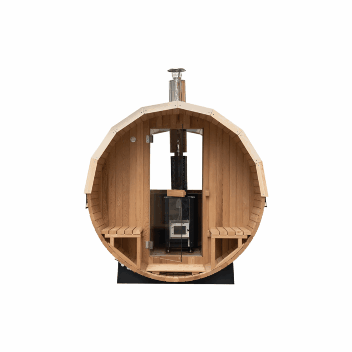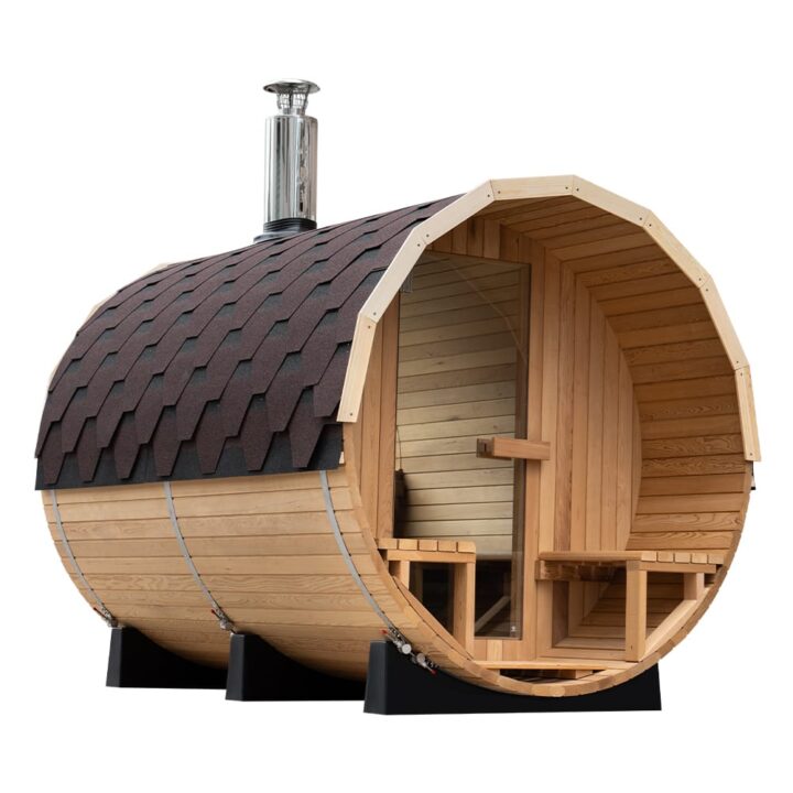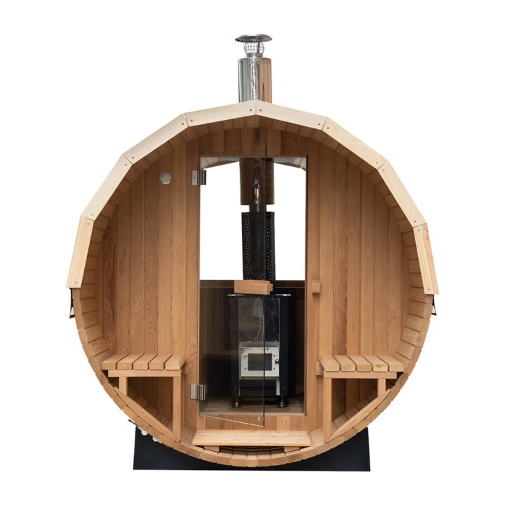Saună exterioară, tip butoi, pin termotratat, 4-6 persoane cu sobă pe lemne și perete de sticlă