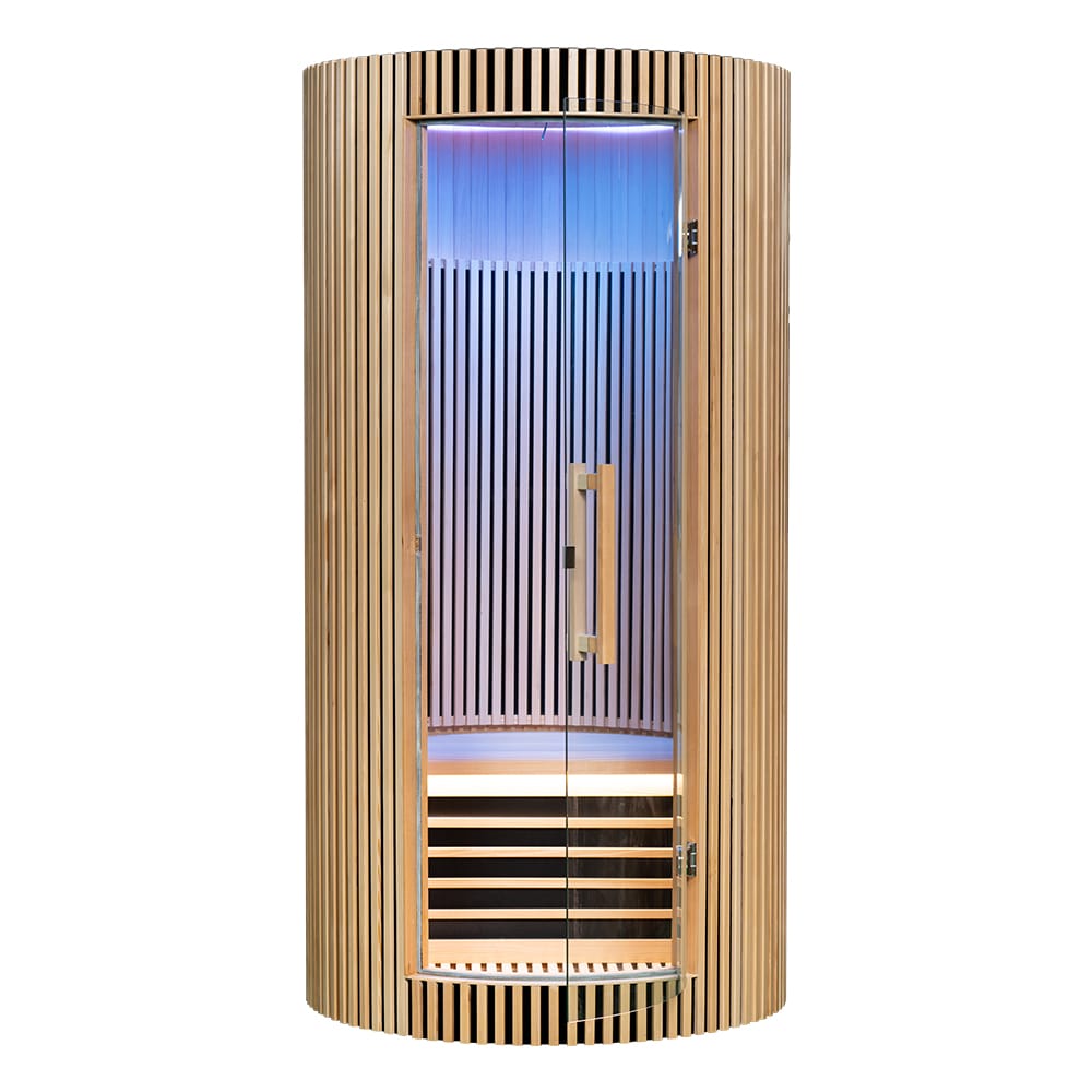 Un concept unic de saună infraroșu pentru uz personal – această saună rotundă din Tei Termotratat pentru 1 persoană combină eficiența unui sistem de încălzire cu panouri cu infraroșu pentru un efect terapeutic profund și iluminare ambientală,pentru o experiență de wellness modernă și relaxantă.